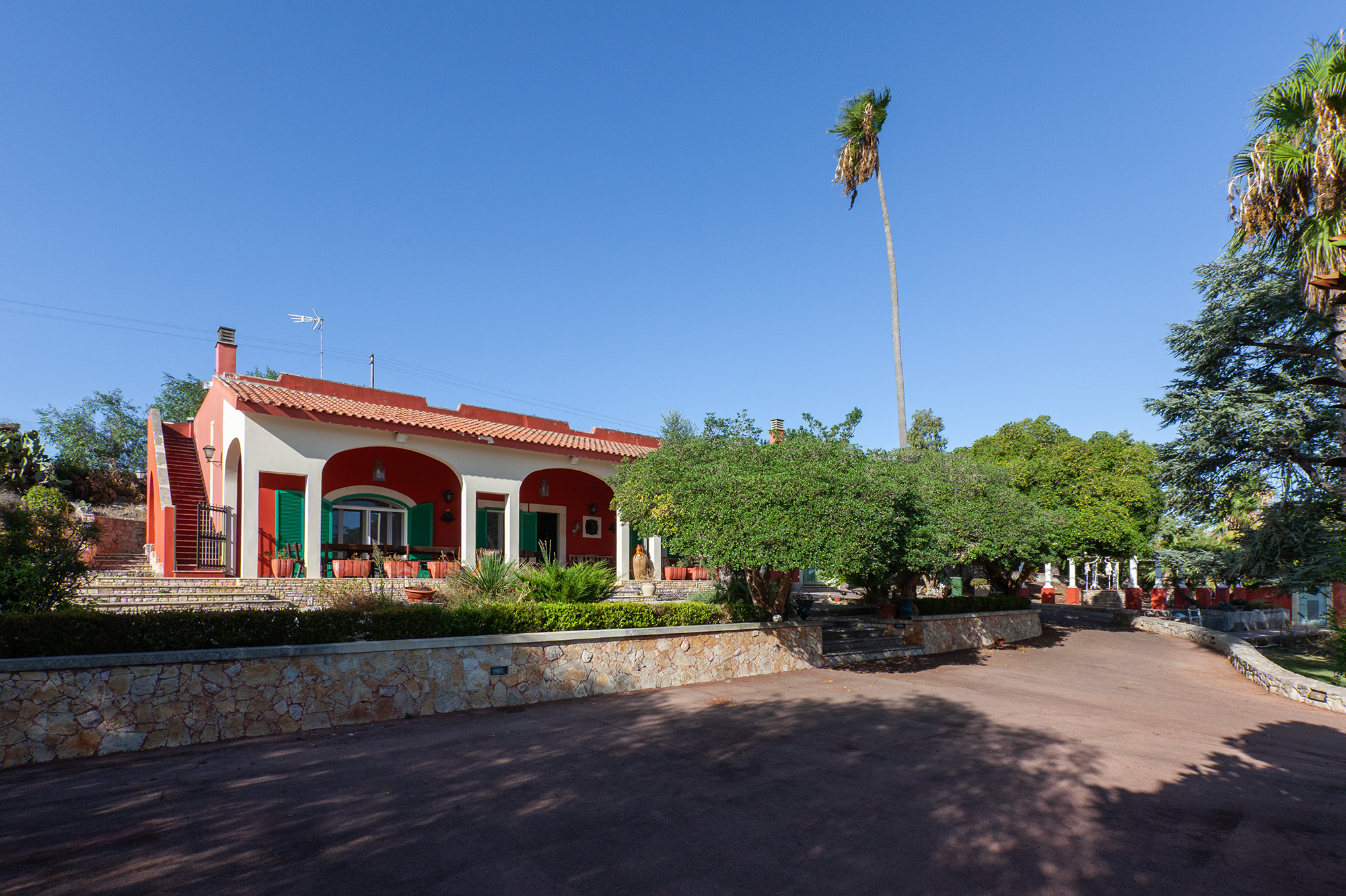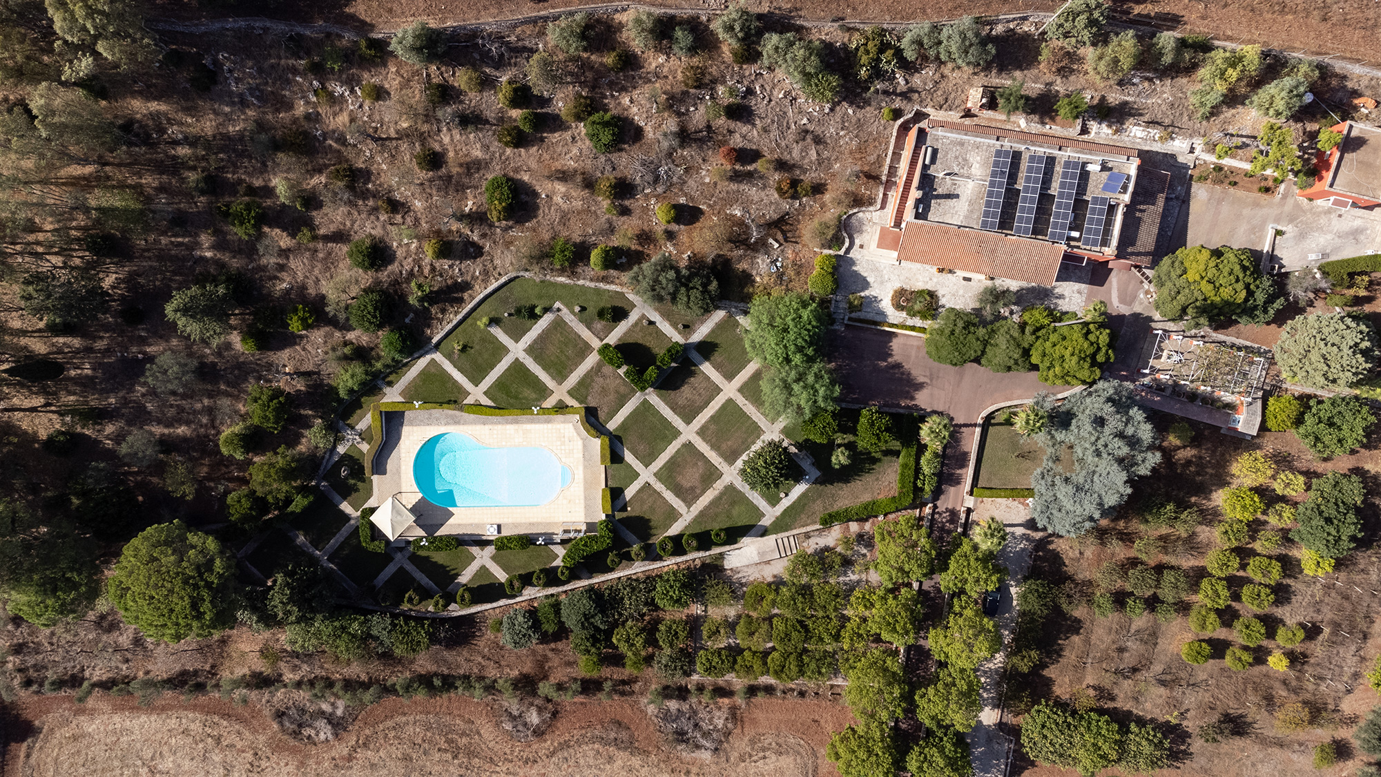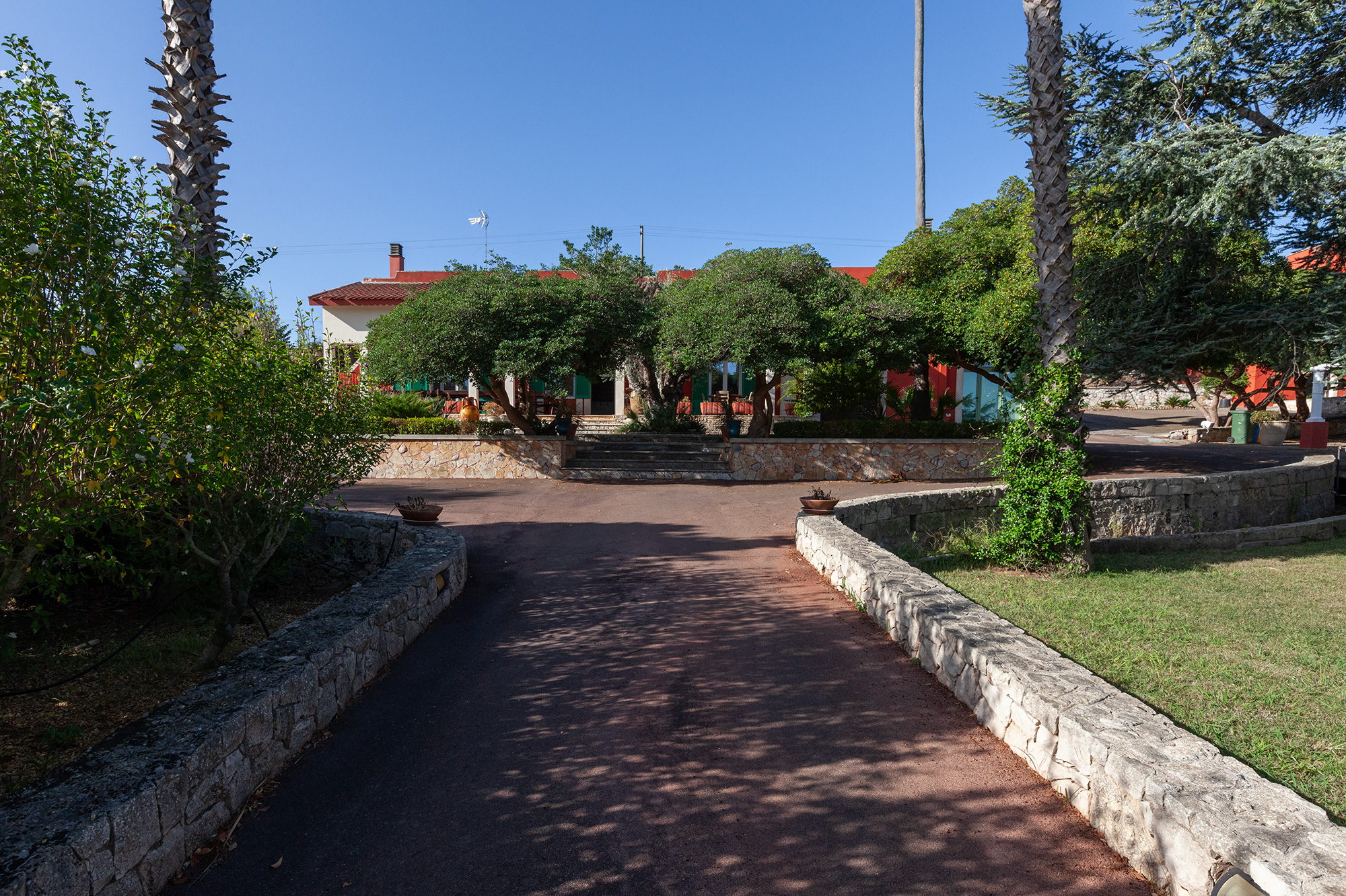 Nelle soleggiate campagne Salentine, appena in periferia dell'elegante Galatina, vediamo una meravigliosa tenuta rurale, che sorge su una leggera altura, per godere di un panorama privilegiato sulle distese verdi del tacco d'Italia. La proprietà presenta un importante invito che conduce sul lungo viale d'accesso, costeggiato a sinistra da campi agricoli ed a destra da un curato oliveto. Giunti sul piazzale anteriore, potrete parcheggiare l'auto in uno dei 6 posti privati disponibili e decidere di fare un bel bagno, oppure adagiarvi all'aperto. L'area piscina è un'oasi meravigliosa, di ben 18 per 9 metri con profondità variabile da 1,2 a 3,0. Il prato inglese forma un soffice tappeto verde, intervallato da sentieri passeggio. Delle curate siepi, danno movimento e privacy, impreziosendo il notevole specchio d'acqua. Qui, all'ombra del gazebo relax, potrete sorseggiare un buon drink o leggere un bel libro. Sdraio e sedie sono sistemati nell'aria solarium, per distendersi stimolando la melanina, che vi donerà una salutare abbronzatura naturale. L'assenza di barriere visive fra la villa e la zona piscina, rende tranquillo il gioco dei piccoli soggiornanti, controllati facilmente dai genitori. L'area maggiormente vivibile viene abbracciata da una grande tenuta, al cui interno è presente un oliveto con ben 400 alberi di Leccino. Anche la zona edificata è fine, ma sopratutto estremamente vivibile per garantire alti standard di comodità. Notiamo infatti una spaziosissima veranda coperta esterna, che si sviluppa per tutto il prospetto anteriore. Sistemati in questa zona, luminosa e con un'ottima visione d'insieme sul verde circostante, vi sono 2 tavoli, uno tondo ed uno grandissimo, rettangolare, da circa 20 posti. Nel costruire la signorile dimora, molta attenzione è stata rivolta all'ottimizzazione degli spazi ed all'indipendenza degli ambienti. Per esempio quasi tutte le camere dispongono di accesso diretto esterno, così come il soggiorno e la cucina. La zona living comprende salotto, divano letto matrimoniale, camino, parte per pranzo (tavolo con sedie) e mobilia varia. Da qui, pochi scalini, arrivano al corridoio per raggiungere la prima zona notte, dove troverete 3 comode camere (due di esse con accesso all'aperto) e 2 bagni completi. Un terzo bagno è accanto alla sala. Completa il nucleo principale, la grande cucina, corredata di tutti gli accessori di cui avrete bisogno: piano cottura, forno elettrico, forno a microonde, lavastoviglie, macchina caffè, bollitore, tostapane ed altro. Due delle 5 camere, non comunicano con la costruzione centrale, ma sorgono accanto ad essa. Entrambe, confortevoli, presentano accesso esterno e bagno completo. Completa la tenuta una bella foresteria, che si compone di un monolocale avente soppalco in legno con zona notte (letto matrimoniale), parte living con divano letto matrimoniale, tavolo e sedie, cucina ad induzione e bagno completo di doccia e servizi. Accanto alla dimora principale vi è poi una depandance, abitata attualmente dal custode della proprietà, composta da un bilocale con bagno completo. Infine una sala è adibita a lavanderia e presenta anche dei quadri di controllo degli impianti. La villa è climatizzata ed un altro notevole pregio è la presenza di un impianto fotovoltaico sul tetto, da ben 12 Kw.