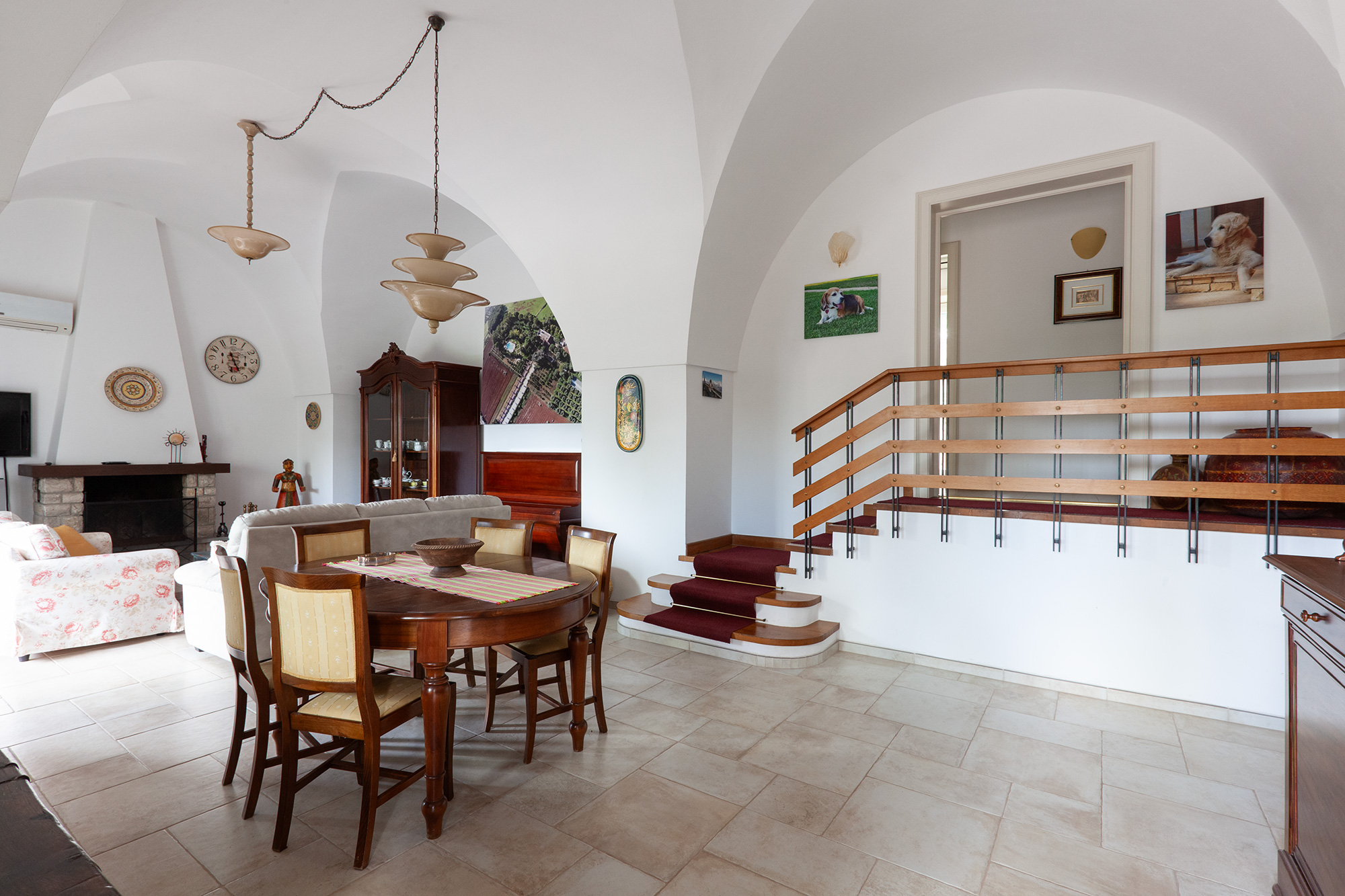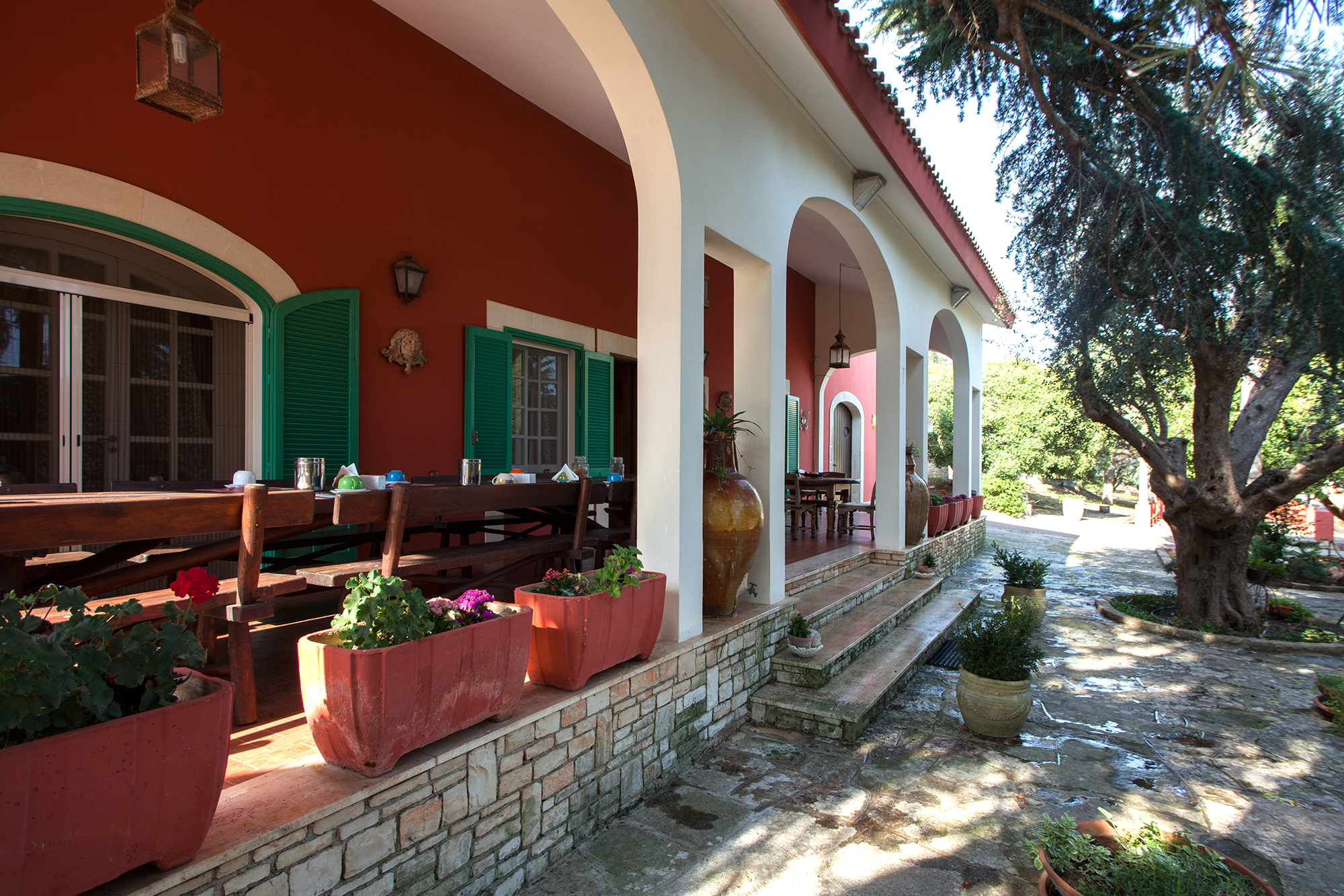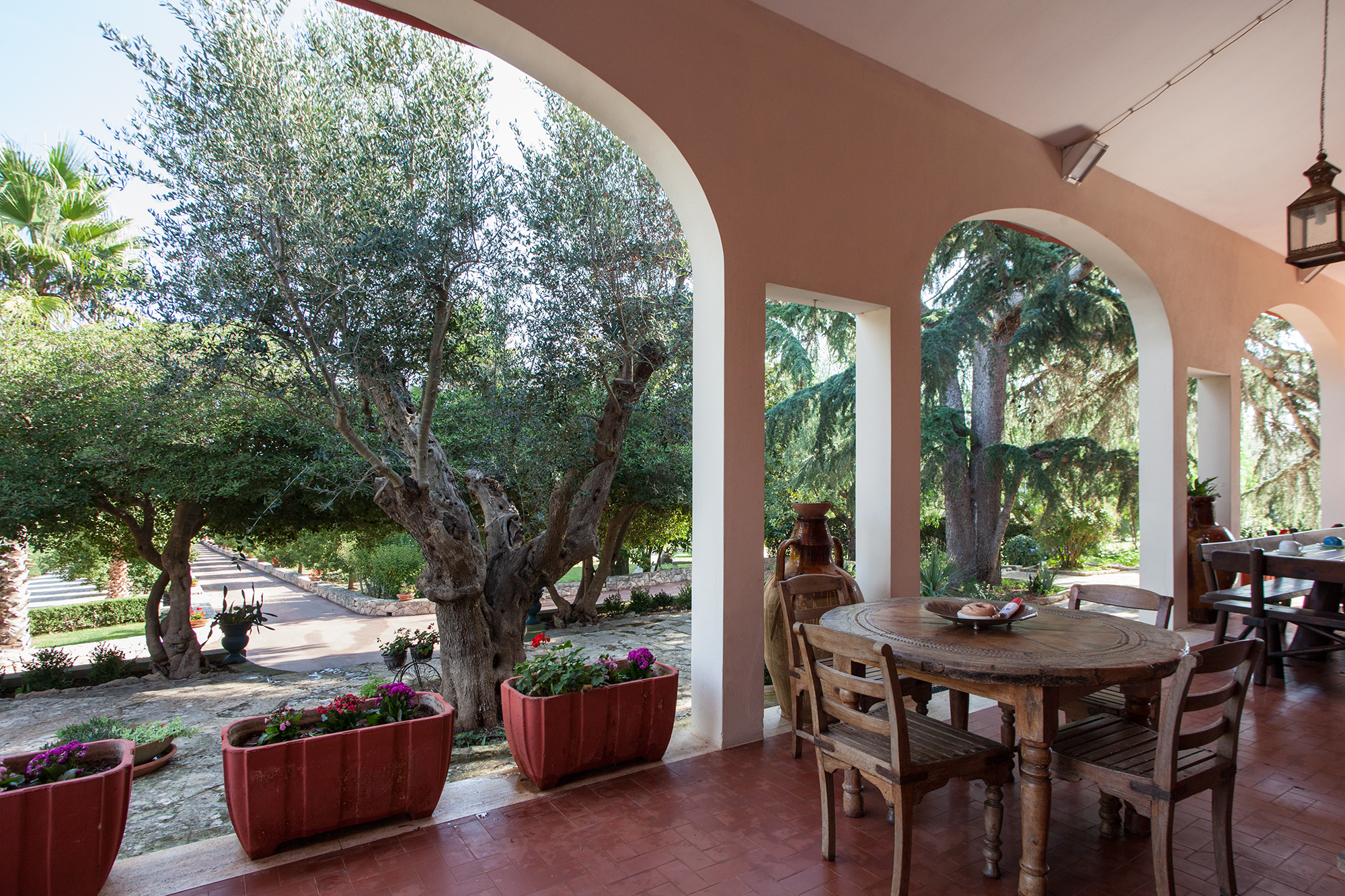 Nelle soleggiate campagne Salentine, appena in periferia dell'elegante Galatina, vediamo una meravigliosa tenuta rurale, che sorge su una leggera altura, per godere di un panorama privilegiato sulle distese verdi del tacco d'Italia. La proprietà presenta un importante invito che conduce sul lungo viale d'accesso, costeggiato a sinistra da campi agricoli ed a destra da un curato oliveto. Giunti sul piazzale anteriore, potrete parcheggiare l'auto in uno dei 6 posti privati disponibili e decidere di fare un bel bagno, oppure adagiarvi all'aperto. L'area piscina è un'oasi meravigliosa, di ben 18 per 9 metri con profondità variabile da 1,2 a 3,0. Il prato inglese forma un soffice tappeto verde, intervallato da sentieri passeggio. Delle curate siepi, danno movimento e privacy, impreziosendo il notevole specchio d'acqua. Qui, all'ombra del gazebo relax, potrete sorseggiare un buon drink o leggere un bel libro. Sdraio e sedie sono sistemati nell'aria solarium, per distendersi stimolando la melanina, che vi donerà una salutare abbronzatura naturale. L'assenza di barriere visive fra la villa e la zona piscina, rende tranquillo il gioco dei piccoli soggiornanti, controllati facilmente dai genitori. L'area maggiormente vivibile viene abbracciata da una grande tenuta, al cui interno è presente un oliveto con ben 400 alberi di Leccino. Anche la zona edificata è fine, ma sopratutto estremamente vivibile per garantire alti standard di comodità. Notiamo infatti una spaziosissima veranda coperta esterna, che si sviluppa per tutto il prospetto anteriore. Sistemati in questa zona, luminosa e con un'ottima visione d'insieme sul verde circostante, vi sono 2 tavoli, uno tondo ed uno grandissimo, rettangolare, da circa 20 posti. Nel costruire la signorile dimora, molta attenzione è stata rivolta all'ottimizzazione degli spazi ed all'indipendenza degli ambienti. Per esempio quasi tutte le camere dispongono di accesso diretto esterno, così come il soggiorno e la cucina. La zona living comprende salotto, divano letto matrimoniale, camino, parte per pranzo (tavolo con sedie) e mobilia varia. Da qui, pochi scalini, arrivano al corridoio per raggiungere la prima zona notte, dove troverete 3 comode camere (due di esse con accesso all'aperto) e 2 bagni completi. Un terzo bagno è accanto alla sala. Completa il nucleo principale, la grande cucina, corredata di tutti gli accessori di cui avrete bisogno: piano cottura, forno elettrico, forno a microonde, lavastoviglie, macchina caffè, bollitore, tostapane ed altro. Due delle 5 camere, non comunicano con la costruzione centrale, ma sorgono accanto ad essa. Entrambe, confortevoli, presentano accesso esterno e bagno completo. Completa la tenuta una bella foresteria, che si compone di un monolocale avente soppalco in legno con zona notte (letto matrimoniale), parte living con divano letto matrimoniale, tavolo e sedie, cucina ad induzione e bagno completo di doccia e servizi. Accanto alla dimora principale vi è poi una depandance, abitata attualmente dal custode della proprietà, composta da un bilocale con bagno completo. Infine una sala è adibita a lavanderia e presenta anche dei quadri di controllo degli impianti. La villa è climatizzata ed un altro notevole pregio è la presenza di un impianto fotovoltaico sul tetto, da ben 12 Kw.