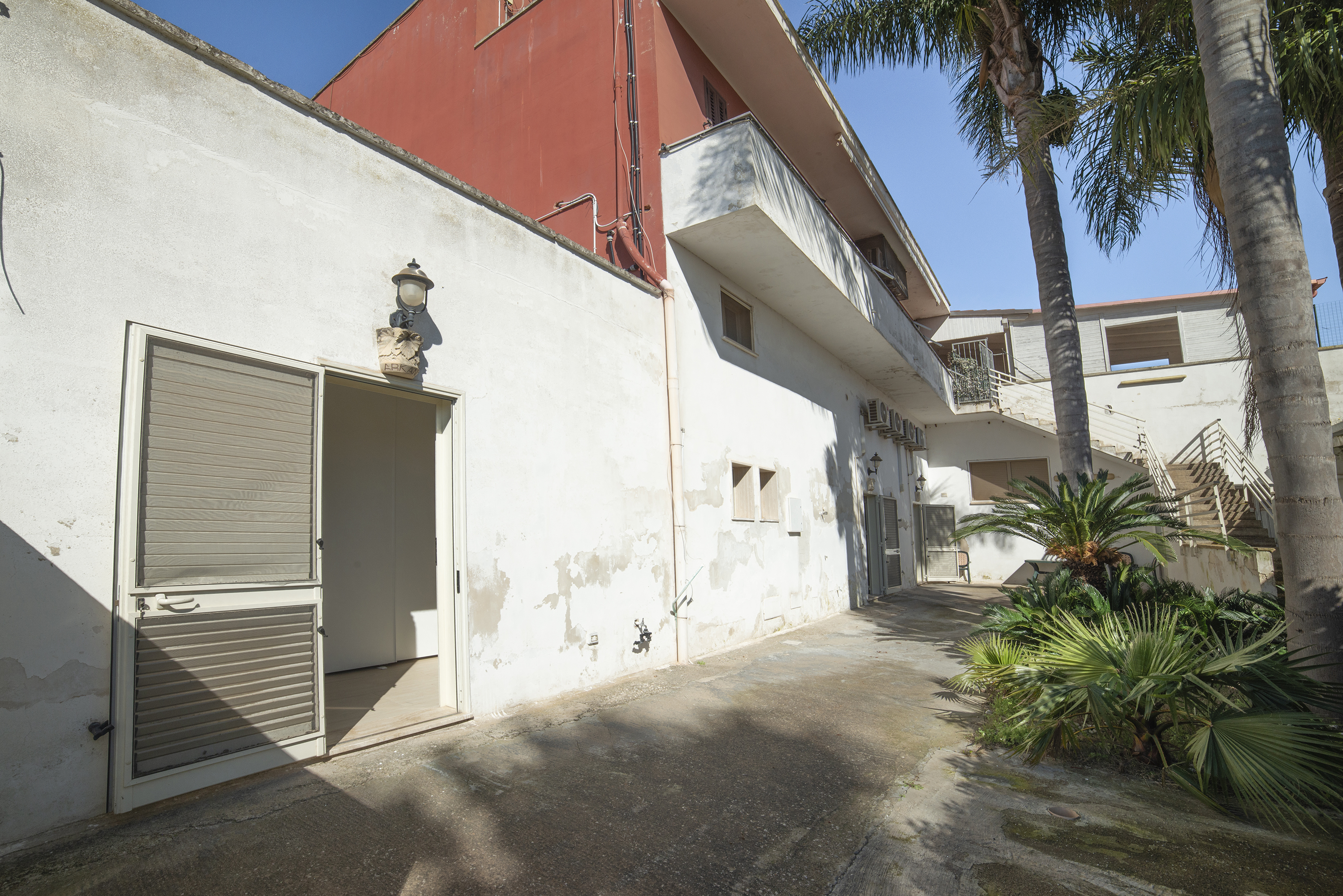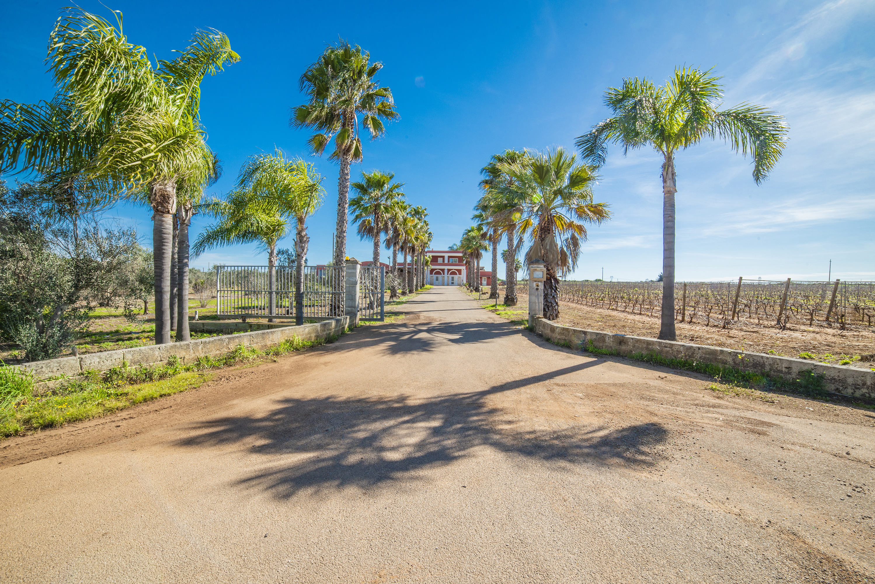 L’ingresso, scenografico e suggestivo, avviene attraverso un lungo viale di palme che introduce a una proprietà di rara bellezza e grande potenziale.