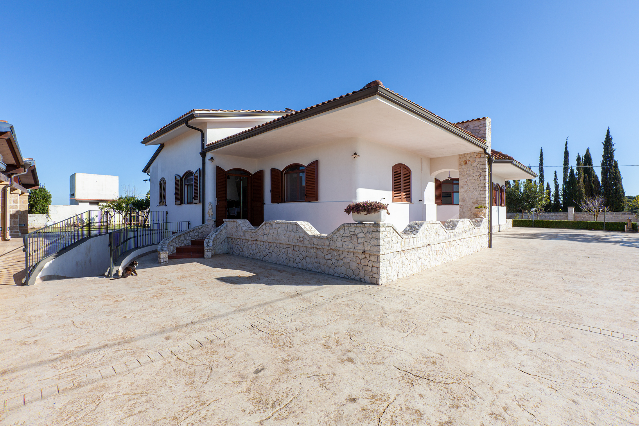 Quando vidi per la prima volta la proprietà in vendita, immaginai le memorabili esperienze che avrebbe regalato: l'esteso giardino con varie ed utili aree, la pregevolissima piscina, i grandi spazi interni con numerosi ambienti ed importanti comfort e la raffinata area turistica circostante da visitare. La visione d'insieme è importante ed anche i dettagli, una persona saggia una volta disse: “se vuoi comprendere il bosco devi guardare la foglia”, per cui vediamo la proprietà nello specifico. L'area esterna si estende prevalentemente nella parte anteriore, centralmente un importante viale carrabile conduce in villa, accompagnato ai lati da zone verdi, con piante ed alberi, di veduta e da frutto. Davanti notiamo una zona parcheggi (immediatamente a destra dell'accesso) ed un caratteristico pozzo antico di veduta (sulla sinistra). Arrivati nell'area prospiciente al corpo costruttivo, abbiamo a sinistra dei graziosi parcheggi (per 4 auto normali) con copertura in legno, delimitati da piacevoli colonne in carparo. Alcuni gradini permettono di raggiungere la zona pranzo, anch'essa coperta, con vista sul verde ed area piscina, attrezzata di tutto l'occorrente (cucina 5 fuochi, importante tavolo, sedie ed altro). La dimora è pensata per ospitare gruppi in maniera esclusiva, che siano insieme, ma con zone intime proprie ed indipendenti. Infatti la villa presenta 3 ingressi, due anteriori ed uno posteriore. L'accesso principale (in posizione centrale sul prospetto) fa raggiungere un disimpegno rettangolare con aperture sui 4 lati. A sinistra una luminosissima camera matrimoniale con 2 finestre, armadio, cassettiera, comodini, luci. A destra un'accogliente stanza da due posti, perfettamente arredata. Proseguendo abbiamo il corridoio, trasversale, che collega un'altra zona notte a destra, con il grande soggiorno a sinistra. Esso possiede anche un accesso posteriore, che, se aperto, crea una direttrice visiva fra l'ingresso e lo specchio d'acqua sul retro. Nella parte notte vi sono due bellissime matrimoniali ed un ampio bagno (box doccia in vetro e servizi). Dall'altra parte il corridoio si apre sul comodo soggiorno avente grande tavolo con sedie, camino in pietra ed arredamento/comfort vari (descritti dopo). Il secondo accesso sul prospetto porta proprio in soggiorno, da qui vi sono 4 connessioni: il cucinino interno equipaggiato di tutto il necessario, un secondo bagno con box doccia e servizi, il corridoio poc'anzi descritto ed un'invitante scala in marmo di accesso al piano superiore con elegante passamano in ferro battuto. Giunti al piano superiore potremo entrare nelle due ulteriori camere da letto. La prima, matrimoniale, ha una particolare parete in vetro. La seconda è la stanza maggiormente grande e possiede 2 letti matrimoniali, comodo bagno en suite con scenico box doccia in vetro satinato. Quest'ambiente possiede propria terrazza privata con salottino e vista sul verde. L'area piscina è incantevole sia di giorno che la sera. Un grande specchio d'acqua di 7 per 14 mt con profondità fissa ad 1,4mt (sicura e resa ancor più rilassante da bellissimi optional). Da una parte le invitanti e comode scale in pietra ad angolo, un esempio di architettura completa (bella e comoda). Nel tratto opposto il bagnasciuga, felicità dei piccini e comodità dei grandi, dove le due lame d'acqua accarezzano i bagnanti che possono concedersi momenti sereni, anche accanto ai getti idromassaggio a fior d'acqua. Il settore adiacente alla piscina vede zone solarium con sdraio, ombrelloni, tavolo e sedie. Due pratiche docce sono vicinissime, poste sul muro del quarto bagno, esterno, anch'esso completo e di sicura utilità. Quando possibile creeremo immagini e video di sera, infatti il pavimento è cosparso di led luminosi, che creano un effetto simile al cielo stellato, un piccolo tributo alla meravigliosa volta celeste, osservabile nelle notti serene. Riepilogando vi sono 6 camere letto, 4 bagni completi, di cui 3 interni, uno esterno e due docce in giardino, fra quest'ultimo e la piscina. Bellissima villa, che potrai acquistare per una vita serena in un magico contesto.